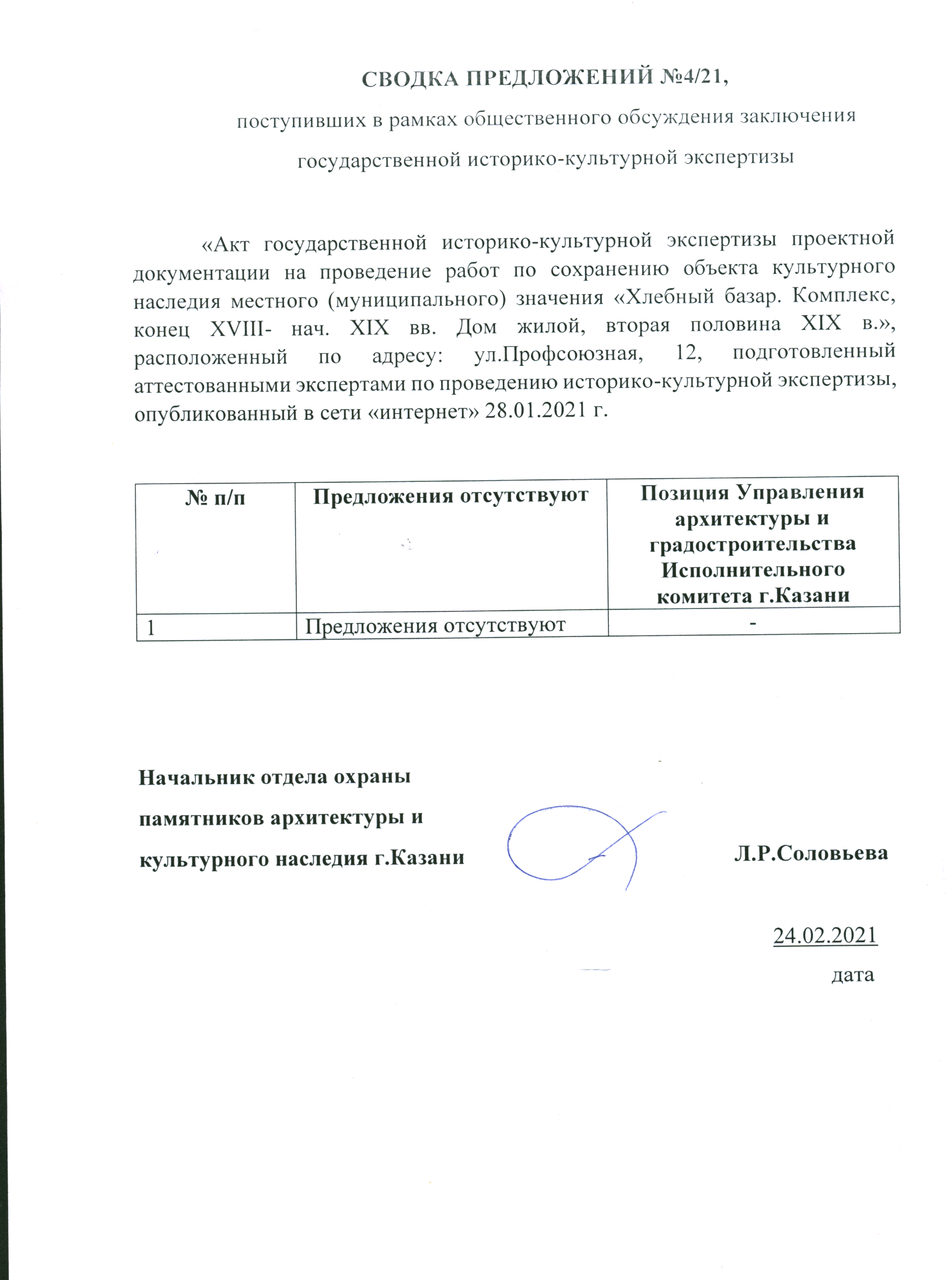 | 19.01.2021 | Объект культурного наследия местного (муниципального) значения «Хлебный базар, конец XVIII-начало XIX века, архитектор Кафтырев», расположенного по адресу: ул.Профсоюзная, д.20/4. | Общественные обсуждения закончены 08.02.2021 | Сводка предложений |